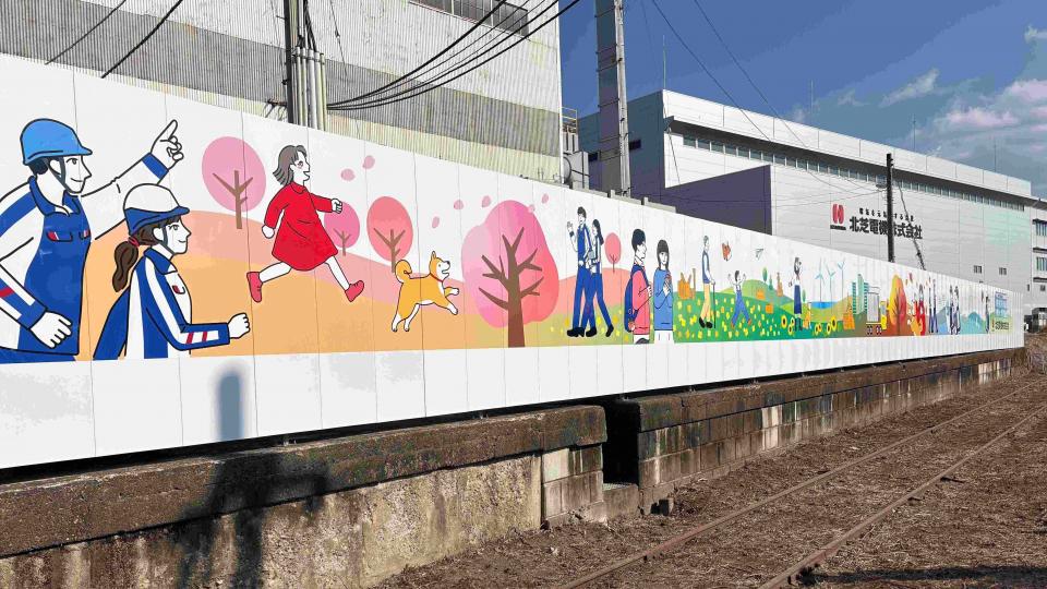 北芝電機では、このたびJR沿線(松川駅方面)に、当社オリジナルのデザインフェンスを施工いたしました。フェンスには、北芝電機の事業所や社員をモチーフにしたイラストに加え、地域の風景や