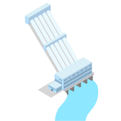 水力発電所では、ダムや川で高い場所から低い場所に水が流れる位置エネルギーを利用し、水車を回して発電します。